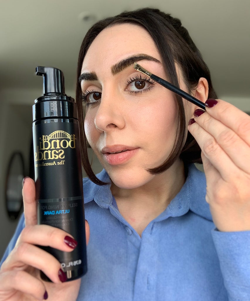 Could fake tanner take the chore out of my lengthy morning brow routine by tinting and filling them in at the same time? I couldn’t let this trick pass me by so I picked up my trusty Bondi Sands Self Tanning Foam Ultra Dark. This is my go-to in the summer when I want to achieve a natural-looking glow to my skin. I decanted three pumps of foam into the lid and watched as it quickly melted down into a liquid, then reached for my angled brow brush [Editor’s Note: an angled brush with a spoolie on the opposite end, like this brush from BeautyPie, is your best bet.]